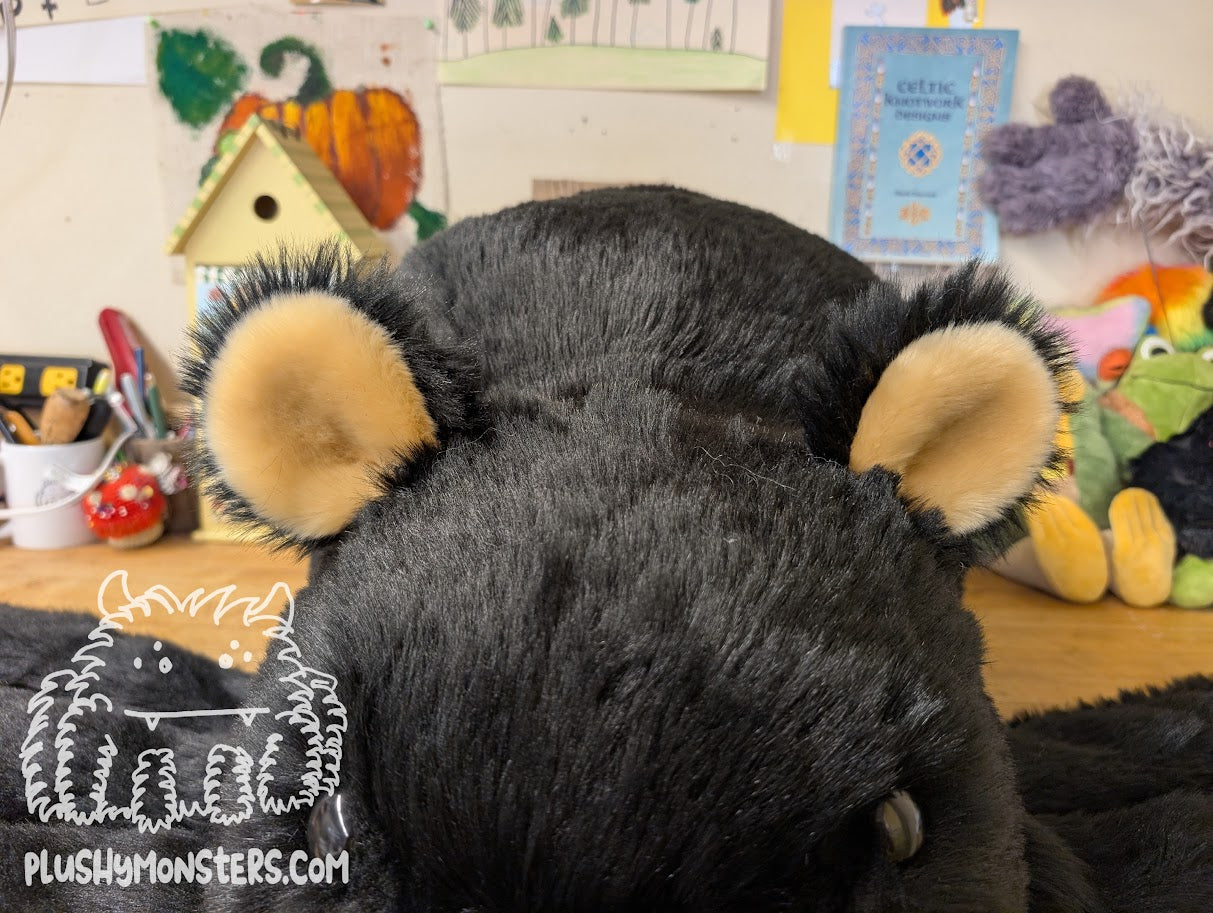 Big'n-sized weighted spider in black and tan faux fur. But with bear ears! And a tail!