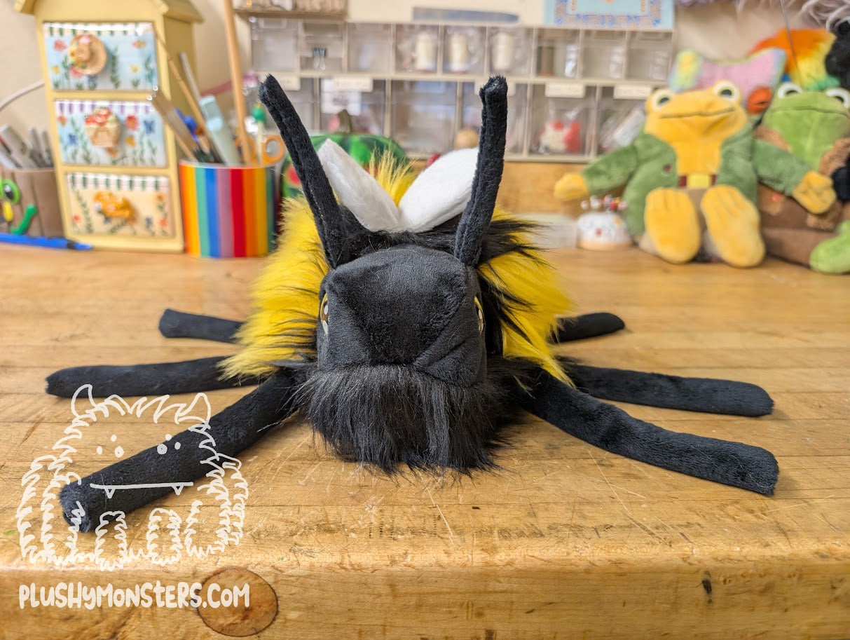 This Big Shaggy Hobo Bumble features large, iridescent yellow kawaii eyes, two floppy antennae, two undersized, derpy wings, a shaggy Poe tummy, a black and yellow stripey booty, and a prominent stinger. This is all to say that these guys are super freaking amazing, and I'm sure you will love them! π₯°