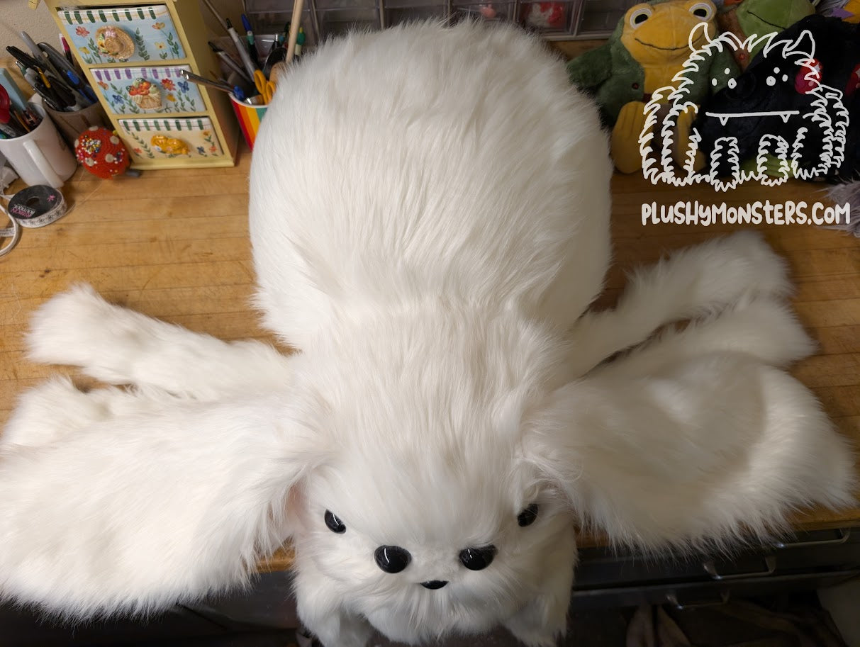 Big Sugar Bunny is a Big'n-sized weighted spider in shaggy white Sugar faux fur, featuring extremely large rabbit ears lined in incredibly soft light pink Beaver faux fur with a matching tail. This is the first of our Bunny Spiders in Disguise to include a shiny black plastic nose, for extra cuteness! 🥰 He would love to be your super chonky new best buddy! 🥰