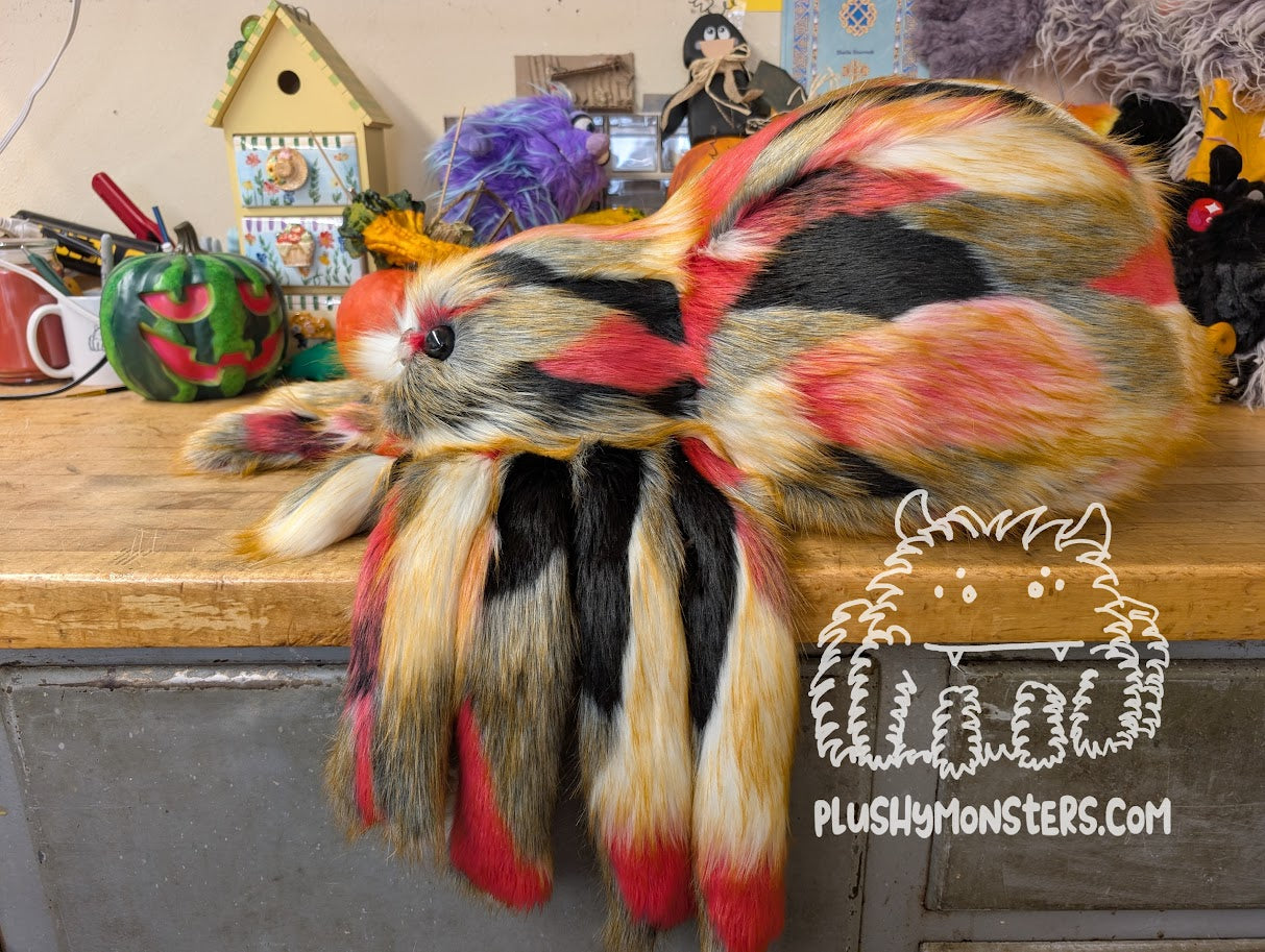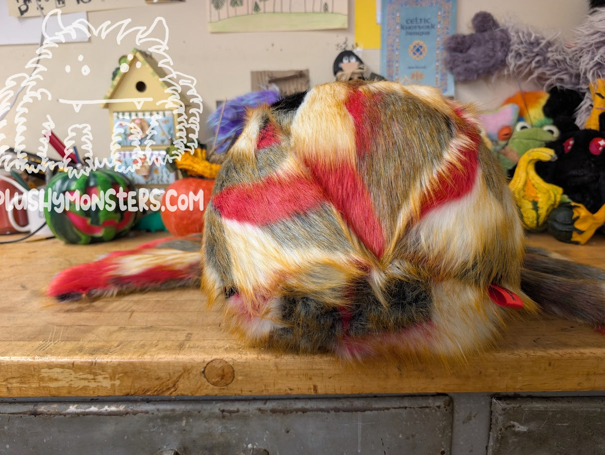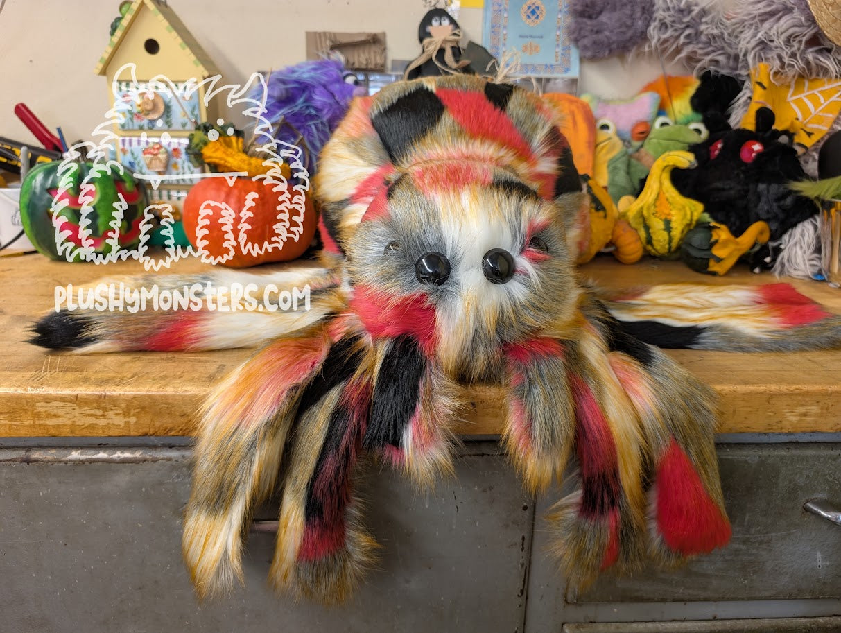 Oak is a Middlin'-sized plushy spider made from splotchy, autumny faux fur fabric and oversized black safety eyes. Maple is a chonky, cuddly sweetheart who would love to come home to you. 🥰
