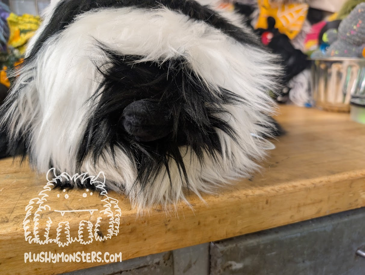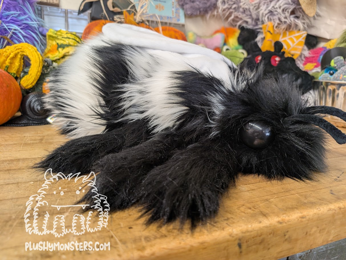 Buzzy is made from shaggy black and white striped Buzzy faux fur and shaggy black Poe faux fur, has super soft, super floppy white minky wingalings, and super soft, sticky-uppy black minky antennae and stinger. He features ginormous 50mm, shiny, black plastic safety eyes and has a layer of glass weighting beads that give him his chonk. He is right about 21" long from the tip of his nose to the tip of his stinger and weighs roughly three pounds. He would love to come home to be your newest, and bestest, insect buddy! π₯°