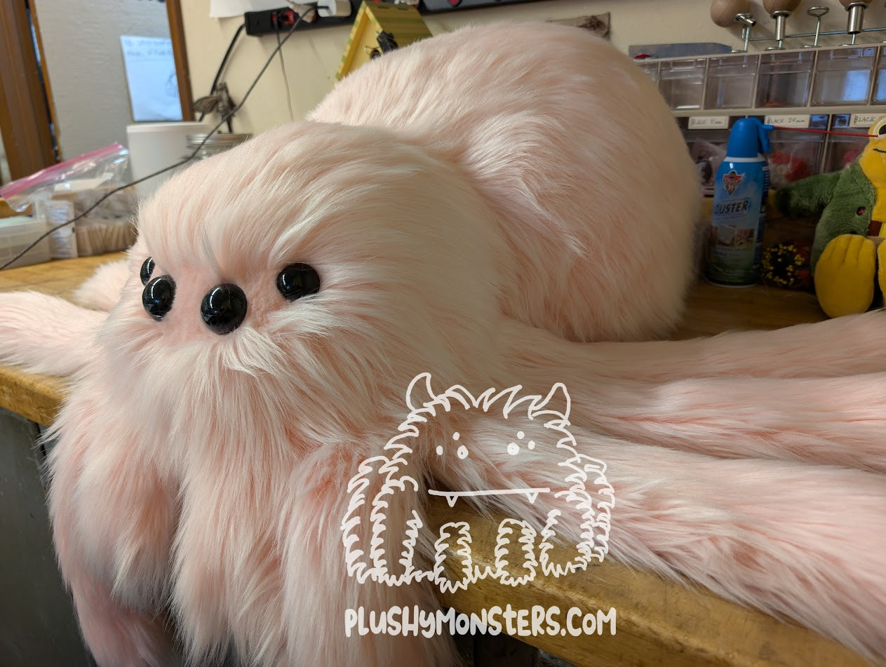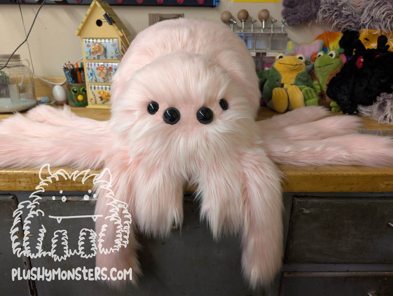 Cherry Blossom is a Big'n-sized weighted spider in light pink faux fur. They are soft, super chonky, shaggy and all-around wonderful. 🥰🥰🥰 They would love to come home to be your newest snuggle buddy!Â