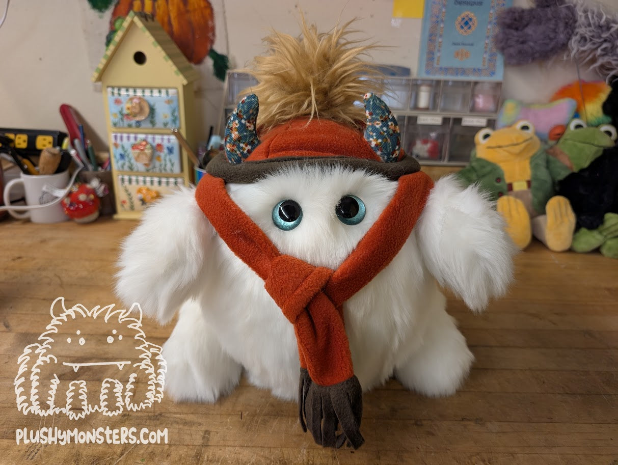 Chuck is one of the chonkiest of the Snowballs we make. 🥰 They are weighted, weighing in at about four pounds, and stand roughly 12" tall. They also have very special, hand-painted eyes, corduroy horns, and super sweet hat and scarf. 🥰 I LOVE THESE ADORABLE, ROLLY-POLY GUYS SO FLIPPIN' MUCH!!! 🥰 Did I mention the sweet hat and scarf?! So stylish! 😁