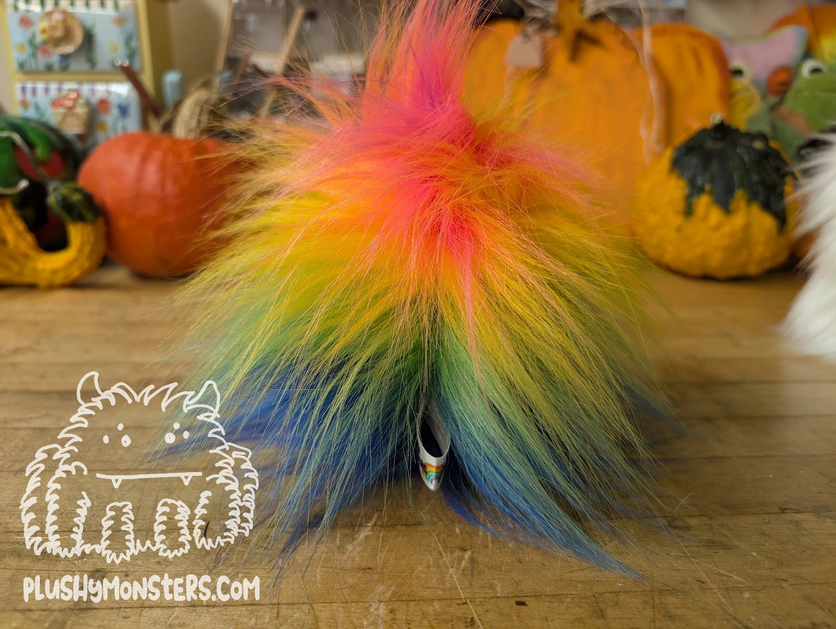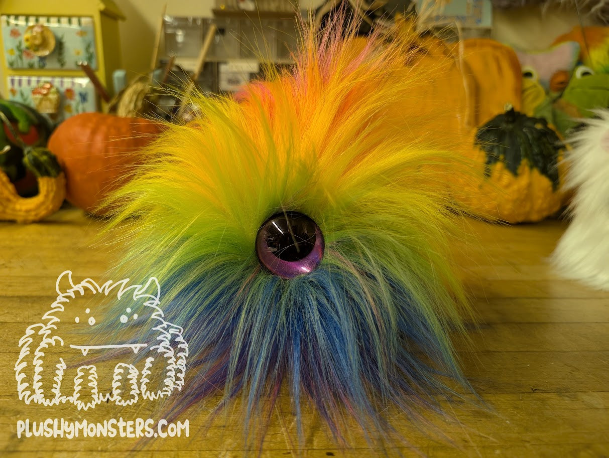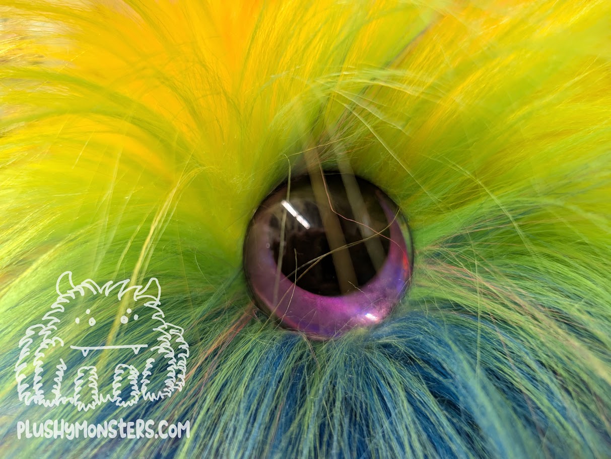 A soft, fluffy Scrappy in Critter faux fur with a single giant purple, offset-pupil eye. So frickin' cute! 🥰