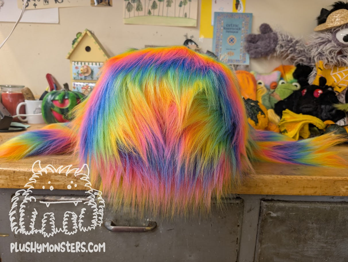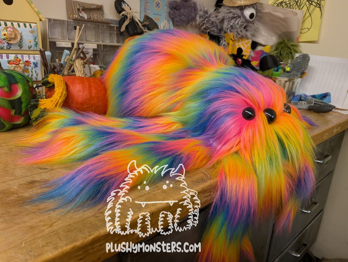 Critter is a Middlin'-sized weighted spider plushy in very long and shaggy rainbow faux fur. This particular Critter has oversized black plastic safety eyes that pop amidst all the rainbow shag, making them extra adorable. 🥰 They would love to come home to be your new best friend!