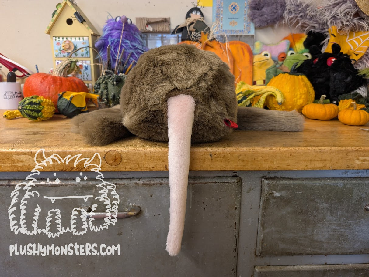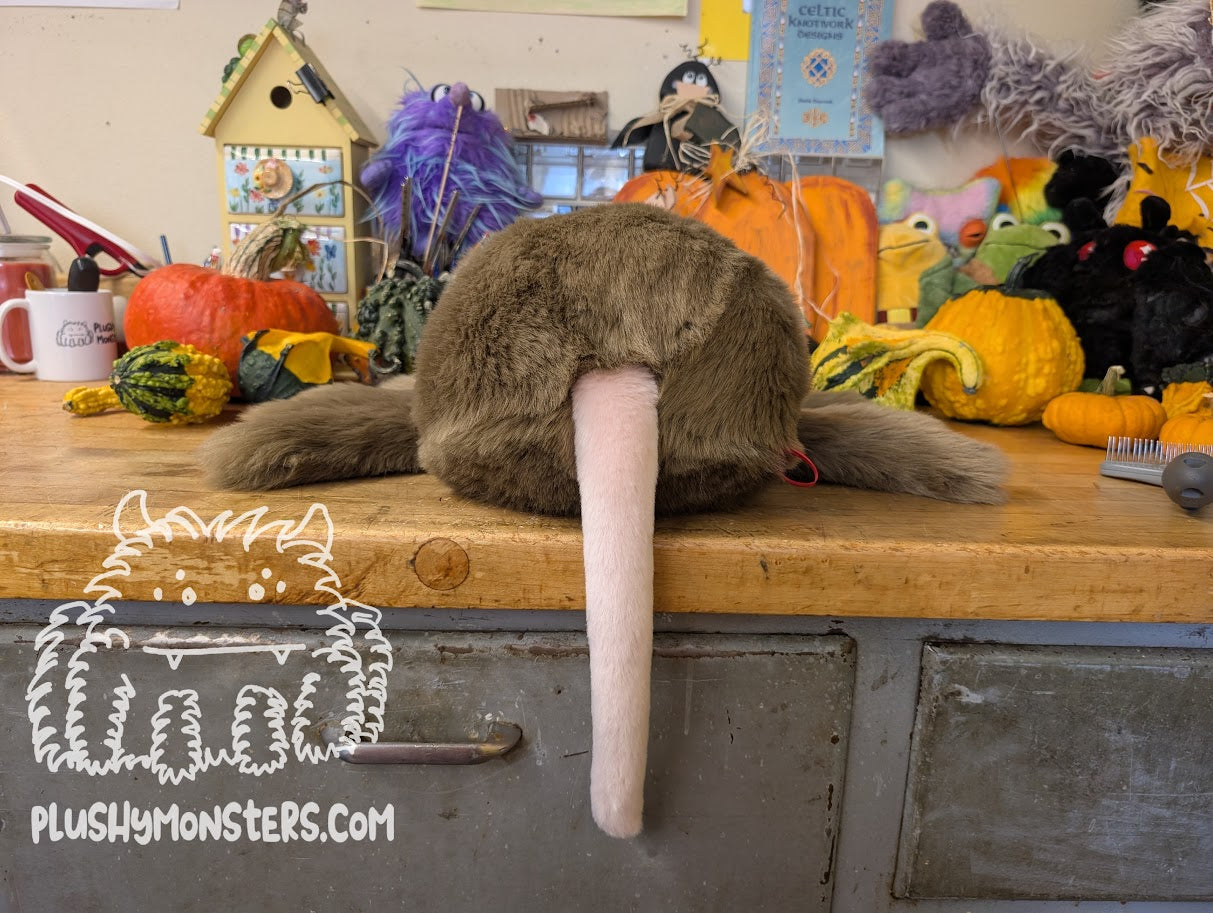 Crumpet is a Lil' Guy-sized weighted spider (/mouse) in Mouse short-pile faux fur. He features large, floofy ears lined in light pink beaver faux fur and a light pink beaver faux fur tail. They also have shiny black plastic safety eyes and a peach wool ball nose. He is filled with polyester fiberfill and weighted with glass weighting beads. Most importantly, they are freaking adorable and hilarious and amazing. I LOVE THEM SO MUCH AND YOU SHOULD ALSO LOVE THEM! 🥰🥰🥰