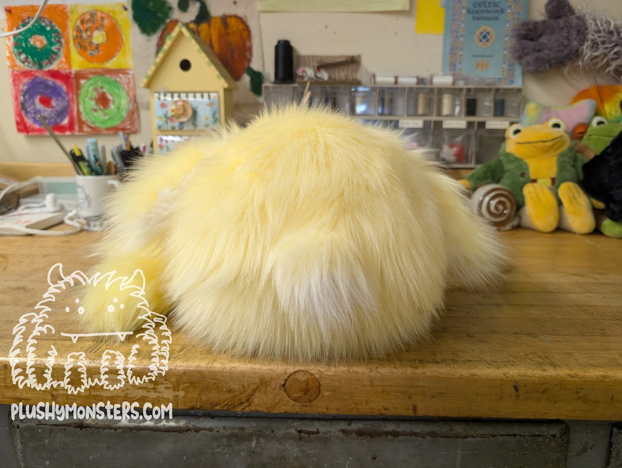 This Lil' Marjereene Ducky is a Lil' Guy-sized weighted spider! Who is also a duck, probably! π He is a little chonky dude, made from shaggy yellow Marjereene faux fur, filled with a layer of glass weighting beads, a bunch of polyester floof, and all the love one snuggle buddy can have for another. π₯° He features two floofy wings lined with shaggy white Sugar fabric and a bright orange plastic duckbill that makes him look super happy, in my personal opinion. He would love to come home to be your newest bestest buddy! π₯°