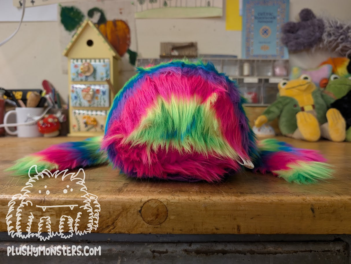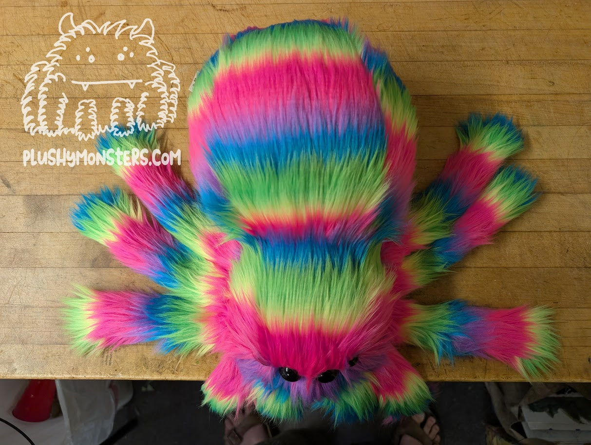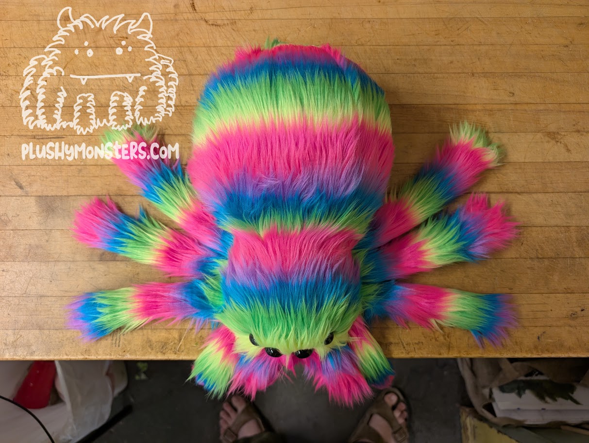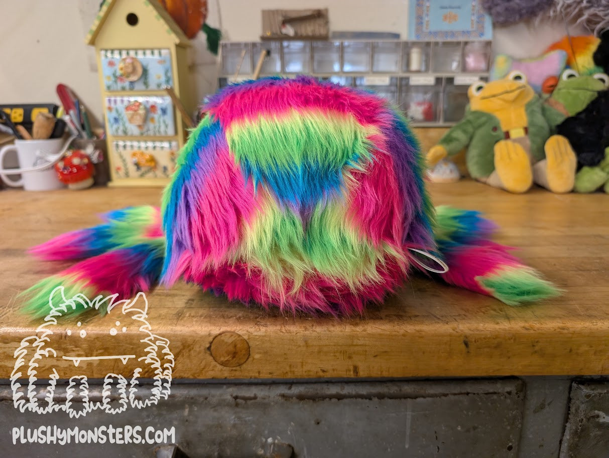 These precious, Lil' Guy-sized weighted spiders were made special with neon rainbow faux fur and the sweetest little face ever. 🥰