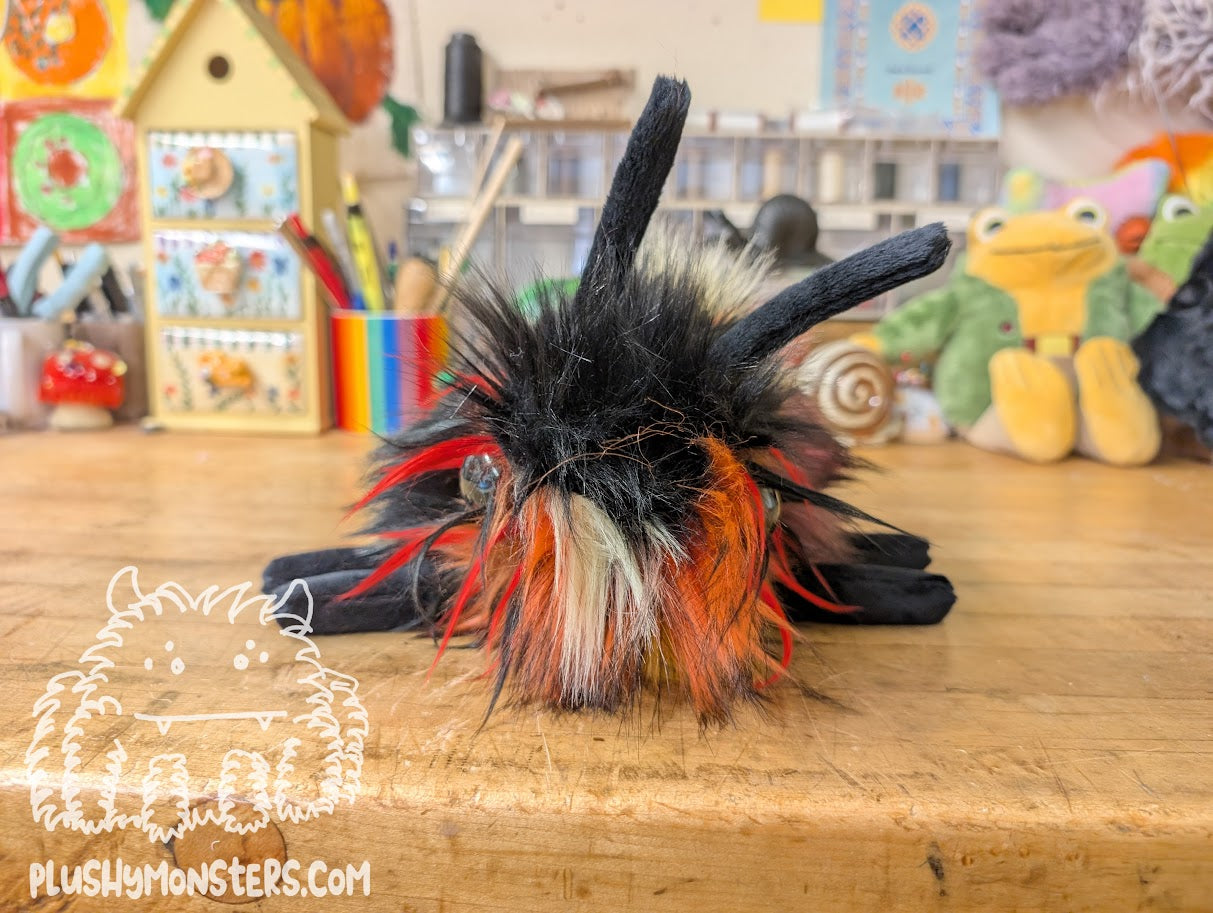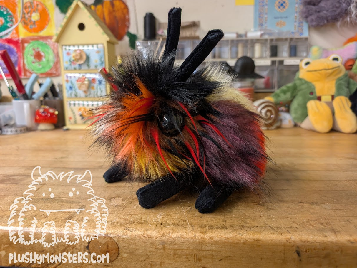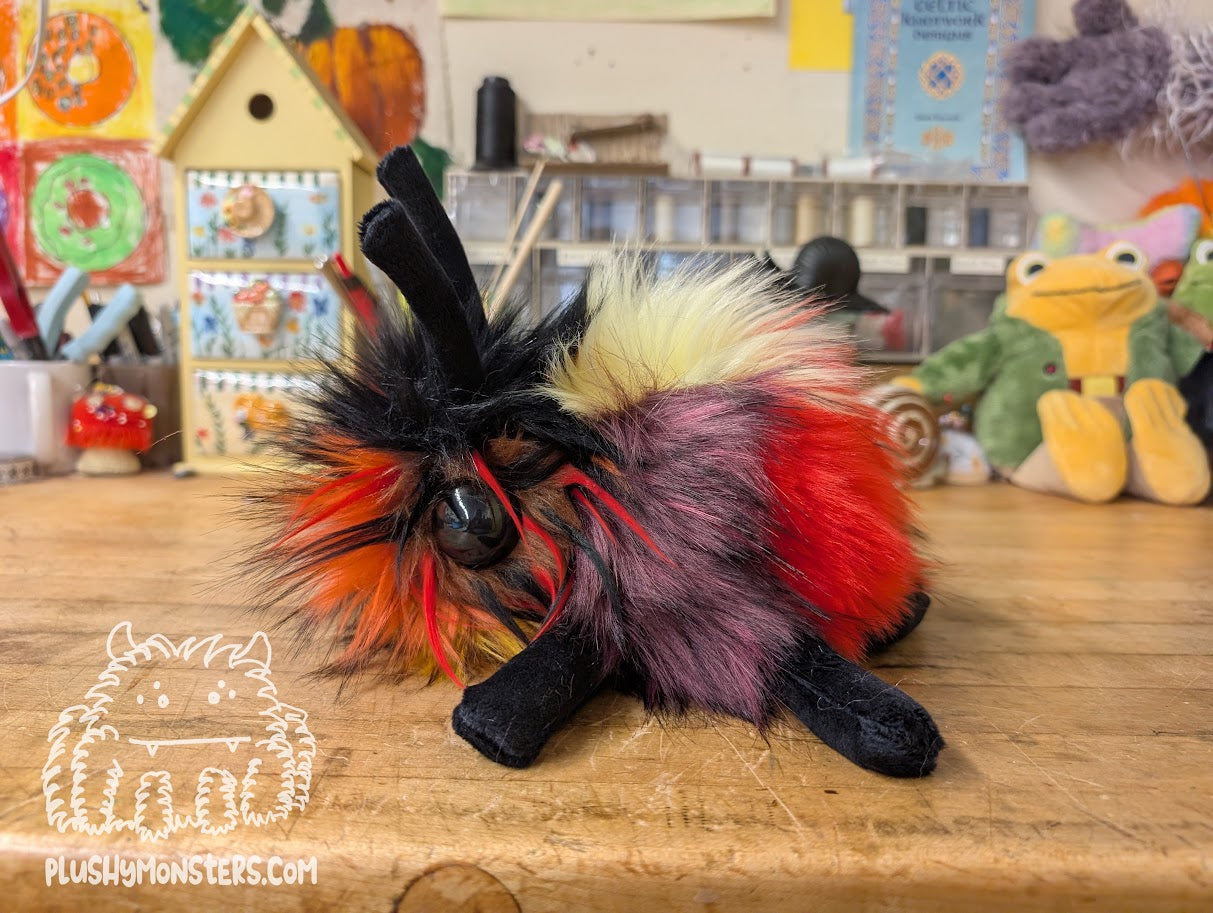 Minestrone Bug is a wonderful Bugomination made by Mom from fabric patched together by Dad. He is incredibly unique and incredibly adorable! 🥰🥰🥰 I love the color scheme and the little spikey bits around his eyes. 🥰 He is a bit of a chonk, weighing in at 1 1/2 pounds and is roughly nine inches long. He is the perfect size for lying in the center of your chest to chill while you read or watch TV. He is a sweet little guy who would love to come home to be your newest, bestest buddy!Â