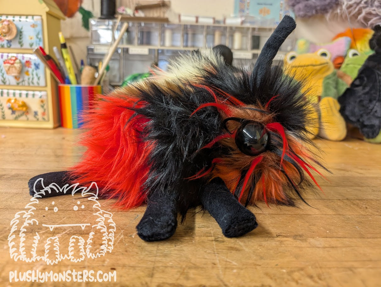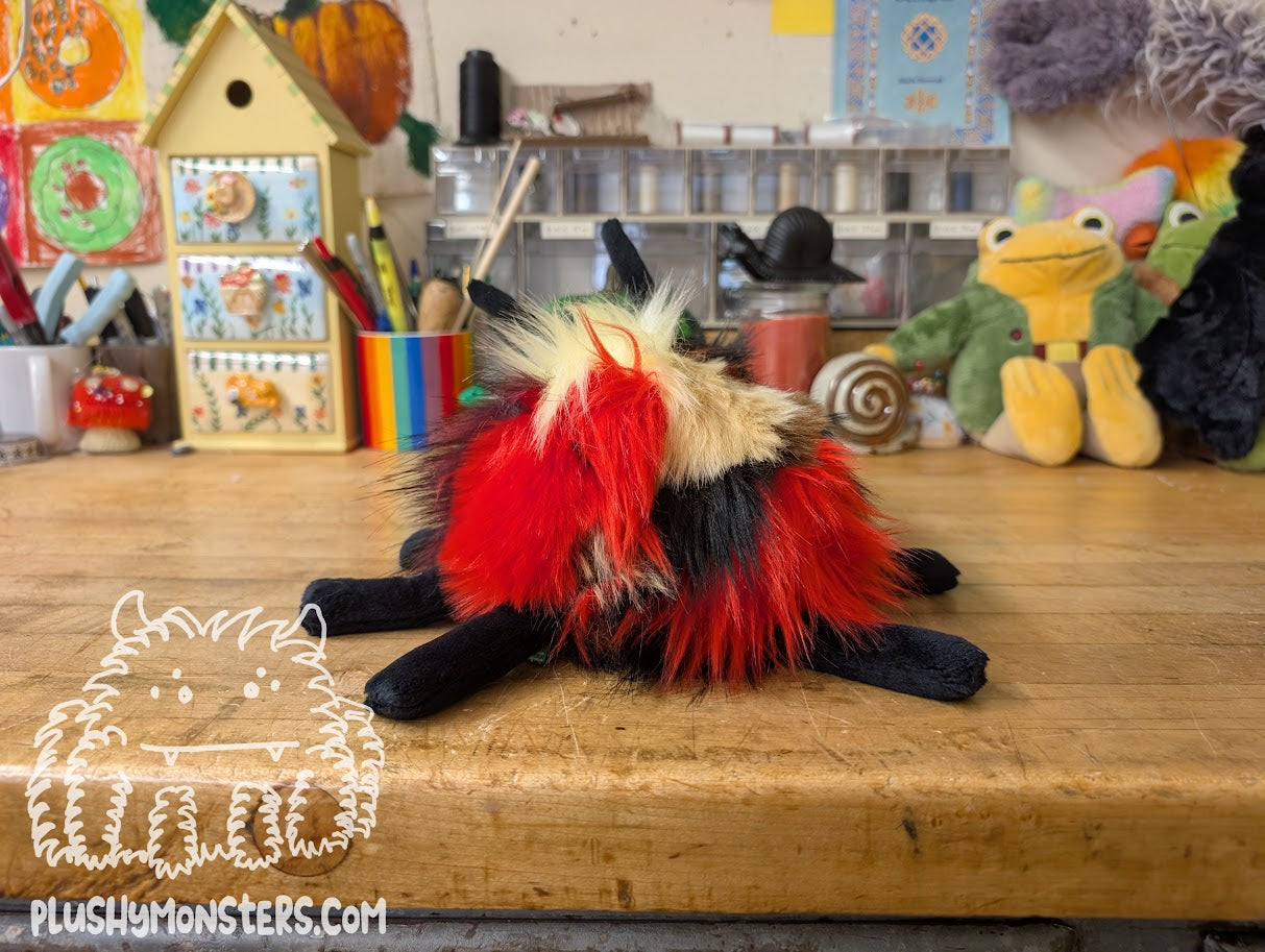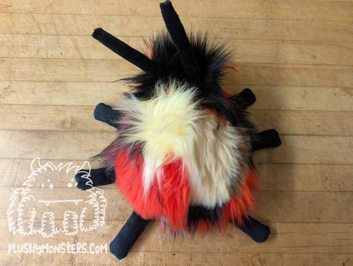 Minestrone Bug is a wonderful Bugomination made by Mom from fabric patched together by Dad. He is incredibly unique and incredibly adorable! 🥰🥰🥰 I love the color scheme and the little spikey bits around his eyes. 🥰 He is a bit of a chonk, weighing in at 1 1/2 pounds and is roughly nine inches long. He is the perfect size for lying in the center of your chest to chill while you read or watch TV. He is a sweet little guy who would love to come home to be your newest, bestest buddy!Â