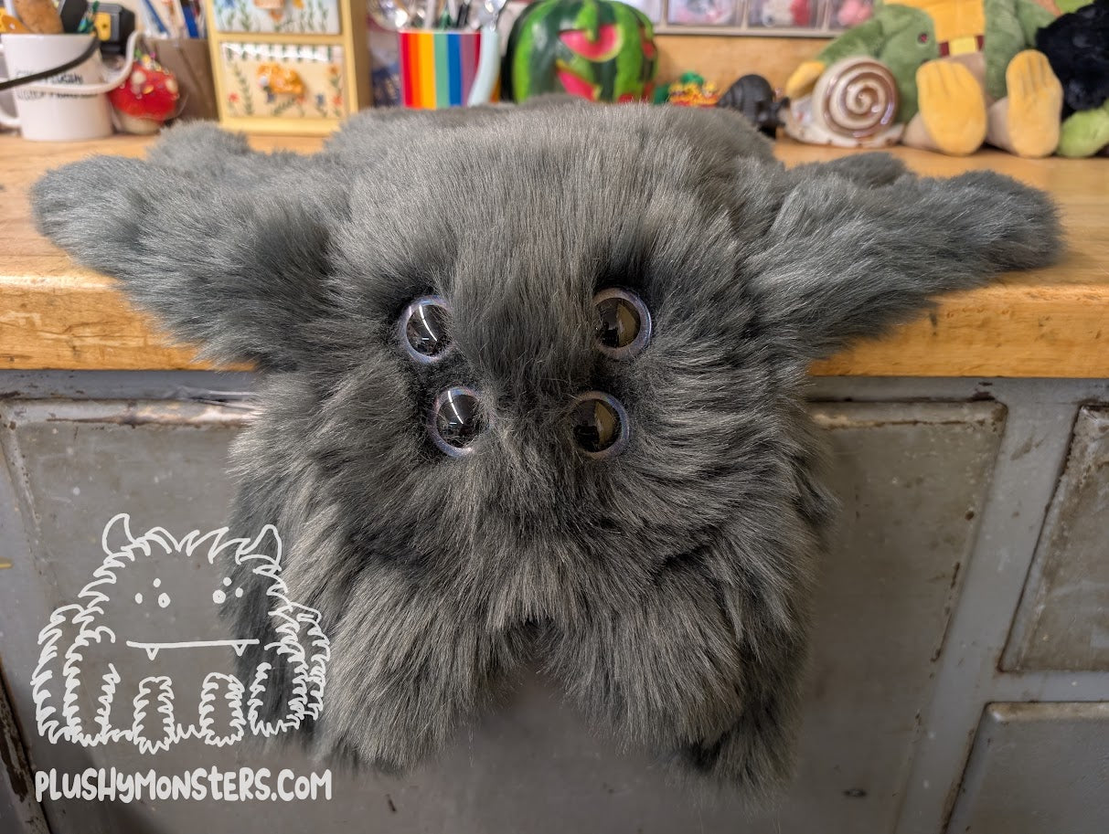 This weighted Pancake Spider is crafted from soft, dark, short-pile Pewter faux fur and features large, glittery silver round-pupil eyes. Not to mention about five pounds of beautifully heavy glass beads. IT'S A CHONK! π