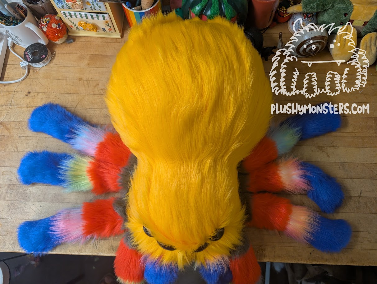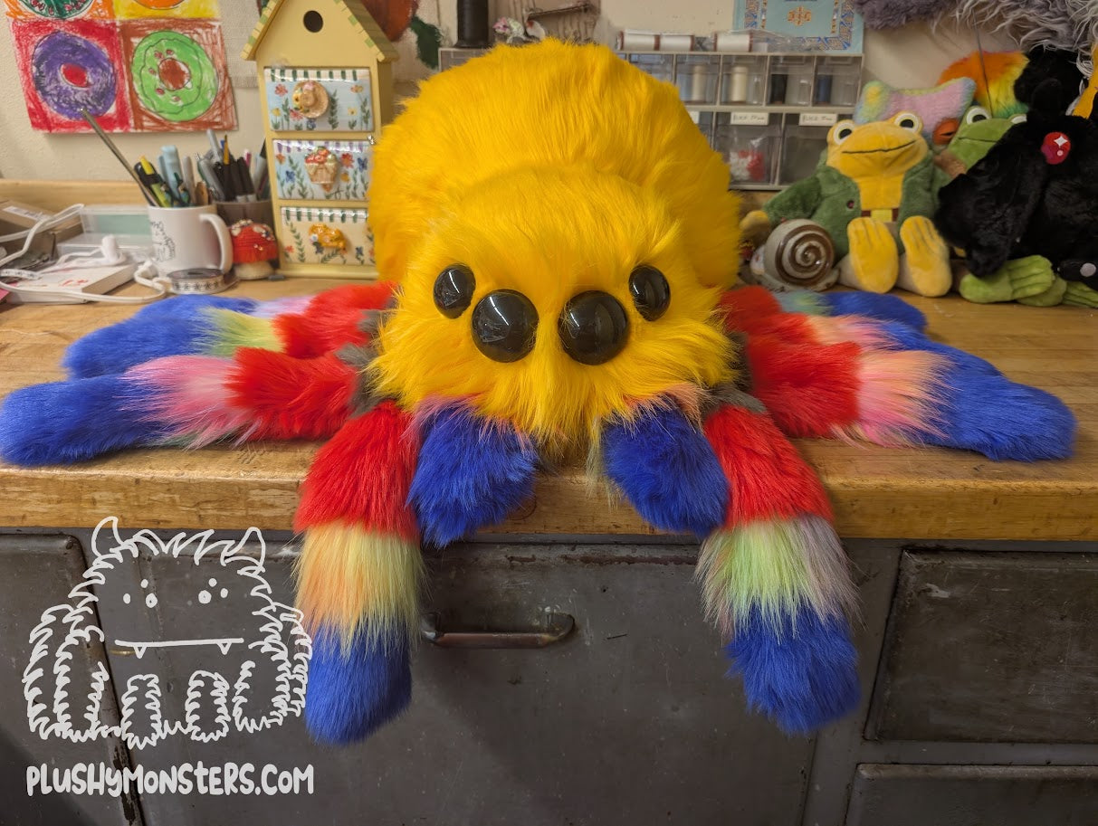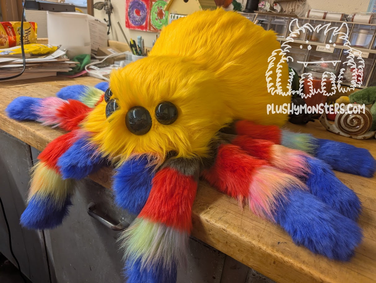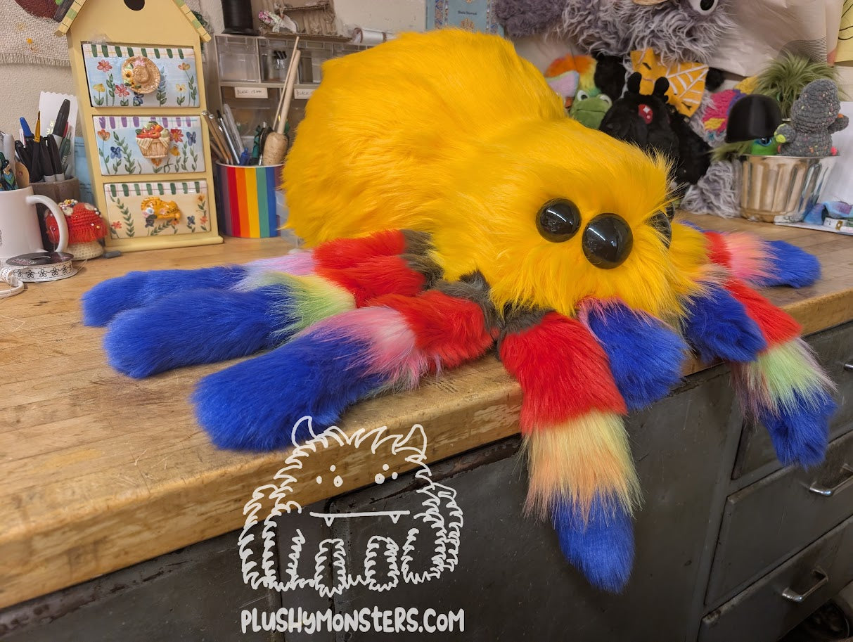 Ringo is a stripey-legged, Middlin'-sized weighted spider in soft, shaggy Mango faux fur with multi-colored stripey legs. 🥰 They turned out so freaking adorably! 🥰🥰🥰 You might also notice their GINORMOUS black safety eyes. Because, Mom. 🥰 Ringo would love to come home to be your newest, bestest friend. 🥰