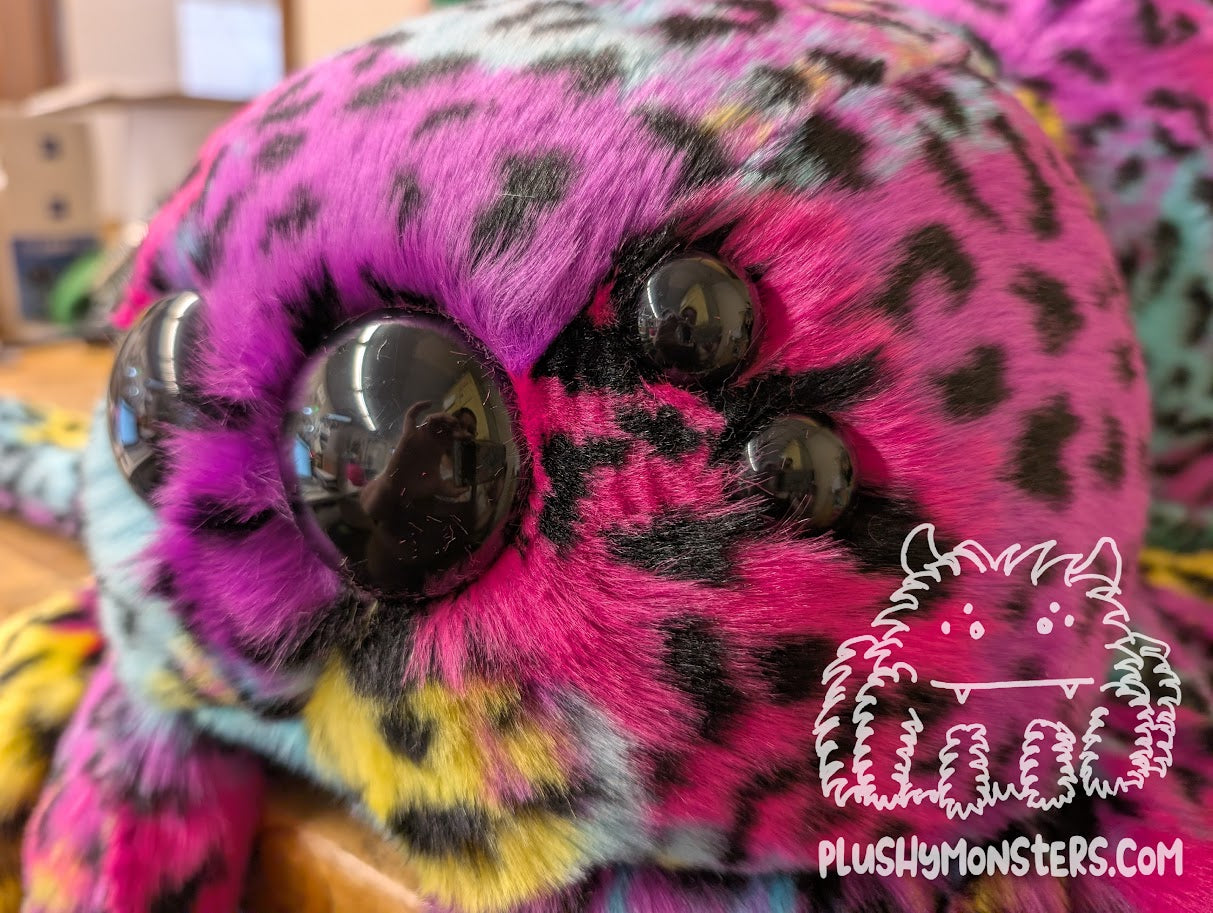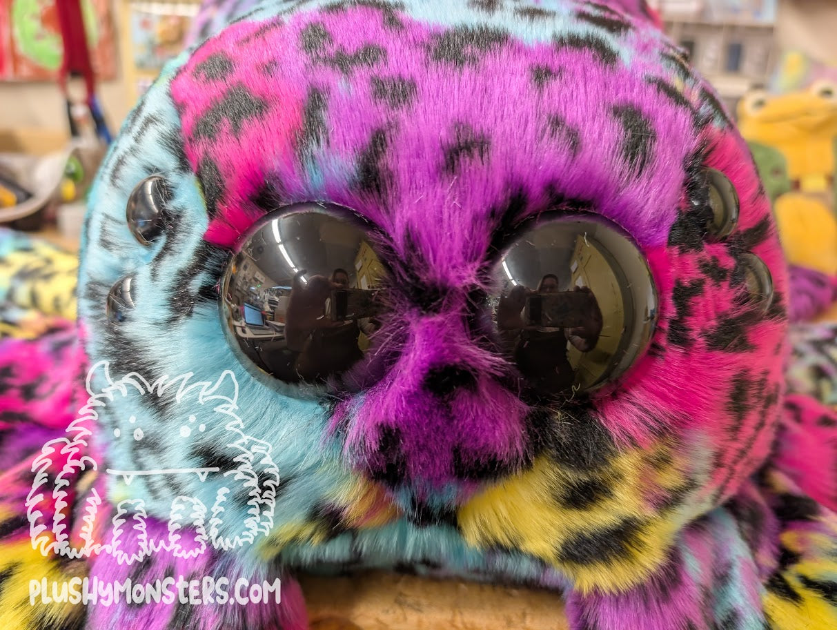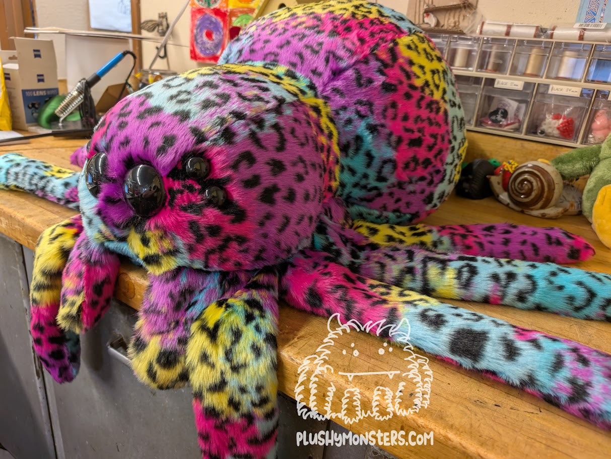 Samuel (so named by Iris) is a Big'n-sized weighted spider in Rainbow Leopard Faux Fur! π This is one of the absolute softest faux furs we use, and is quite a bit shorter than most, making this chonky dude snuggly, indeed. π₯° You might also notice that he has two enormous black safety eyes in the middle of his super adorable face, bordered on the outside by two pairs of slightly smaller safety eyes. He is a void baby, for sure, and would love to come home to be your new best friend! π₯°