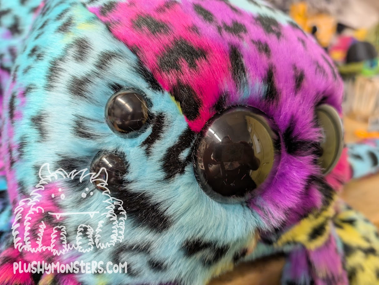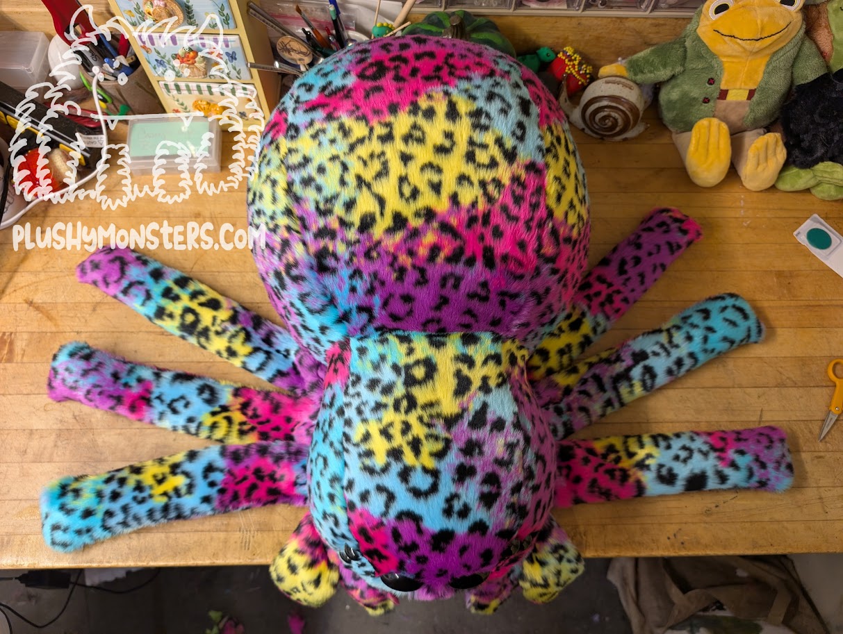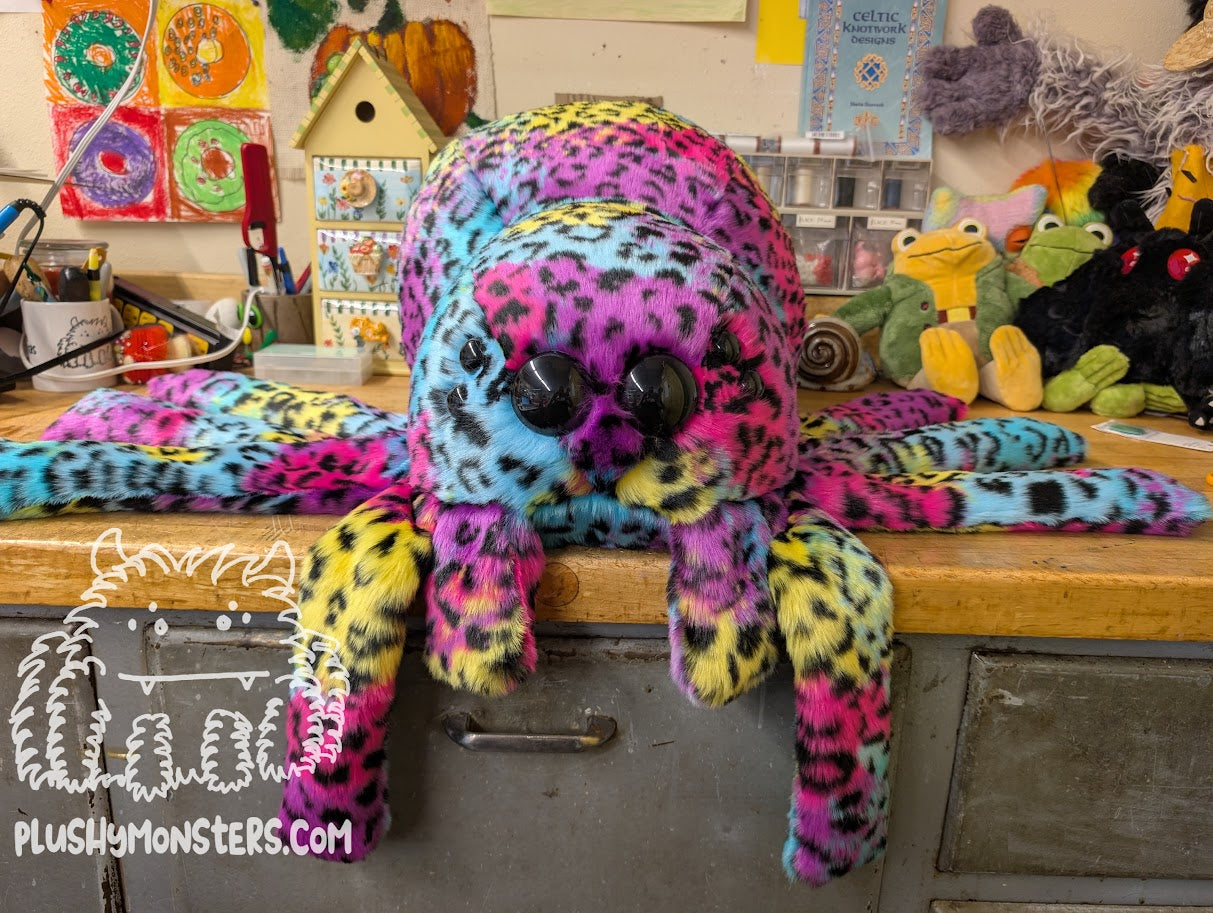 Samuel (so named by Iris) is a Big'n-sized weighted spider in Rainbow Leopard Faux Fur! π This is one of the absolute softest faux furs we use, and is quite a bit shorter than most, making this chonky dude snuggly, indeed. π₯° You might also notice that he has two enormous black safety eyes in the middle of his super adorable face, bordered on the outside by two pairs of slightly smaller safety eyes. He is a void baby, for sure, and would love to come home to be your new best friend! π₯°