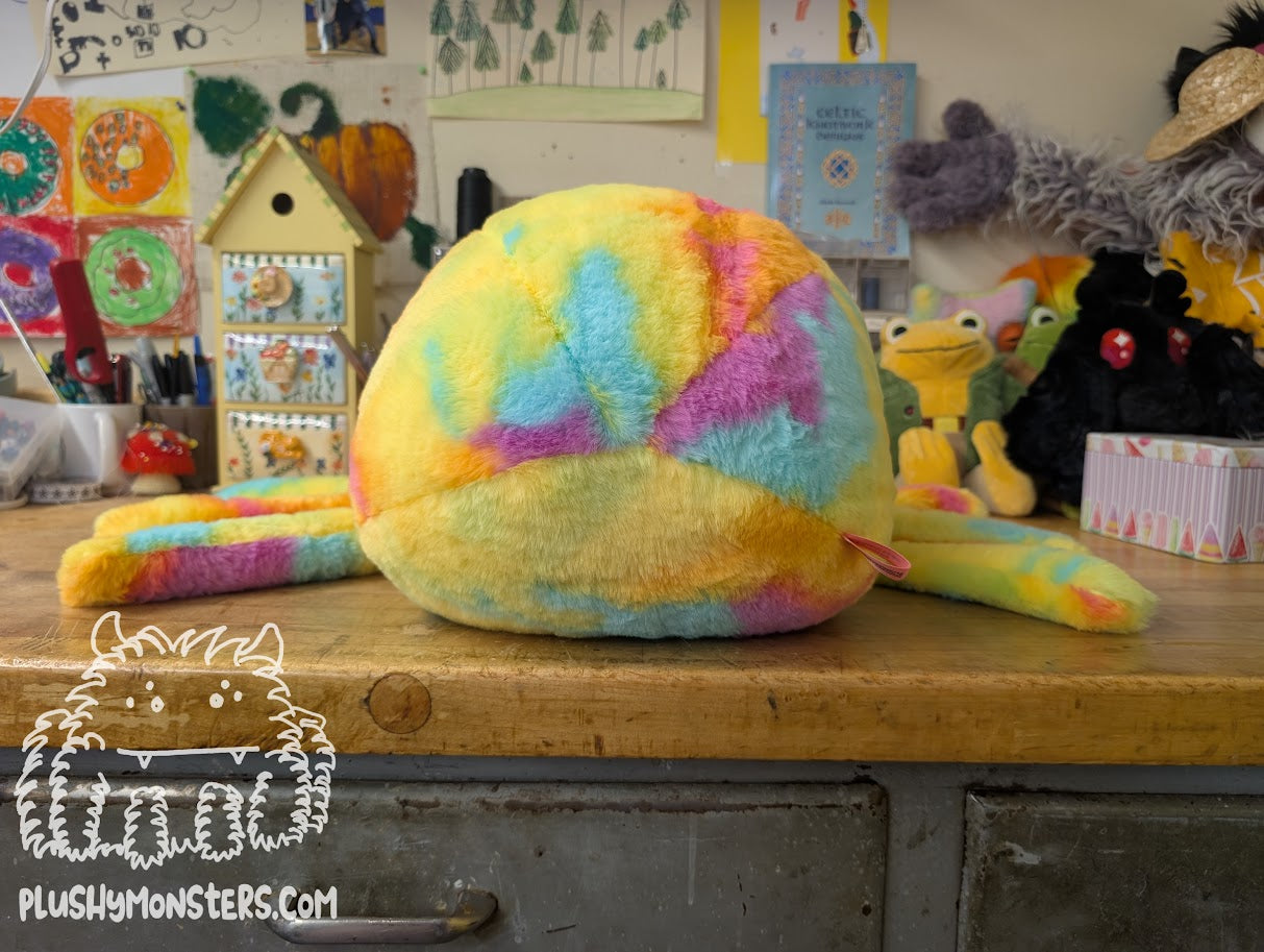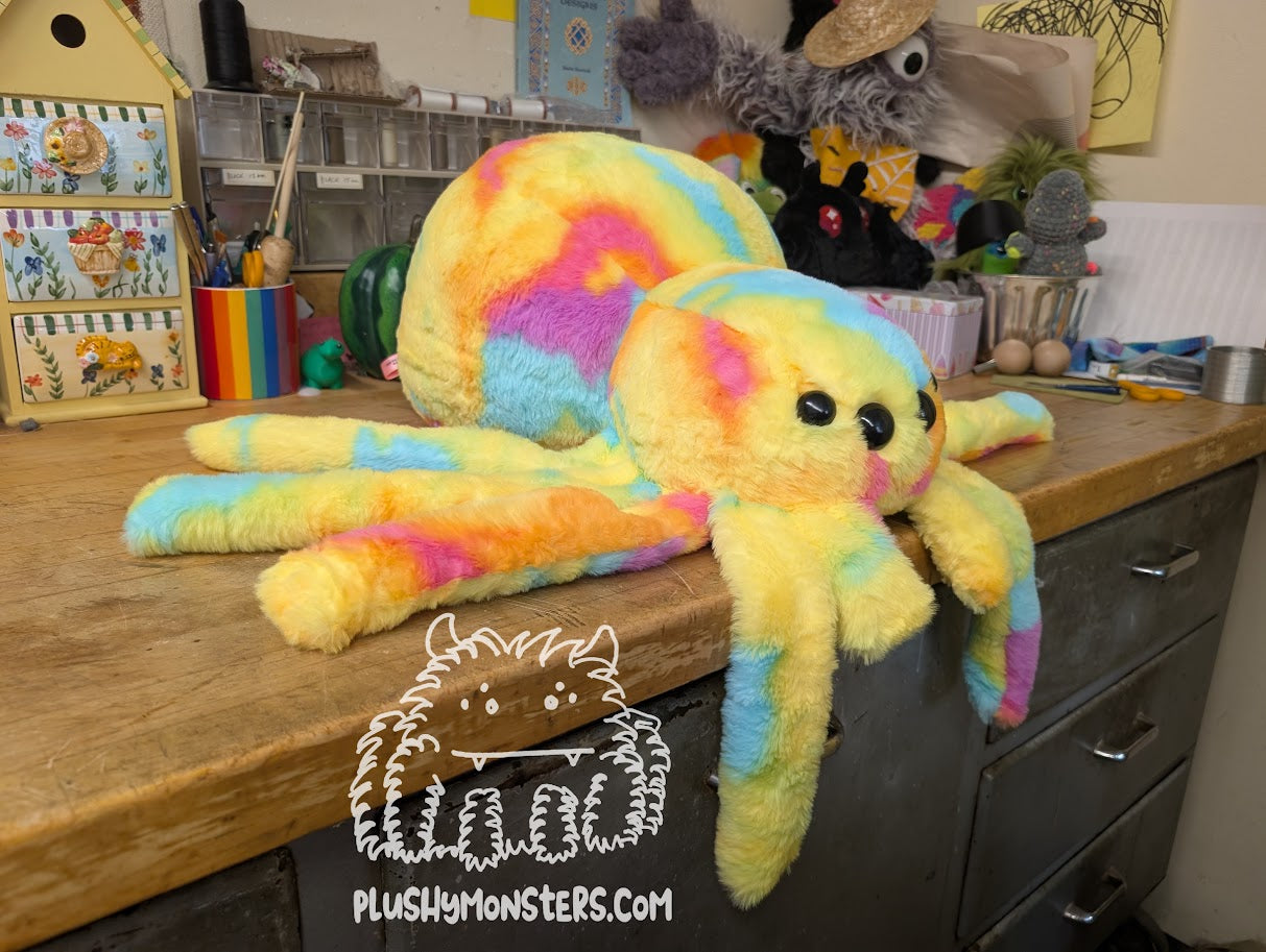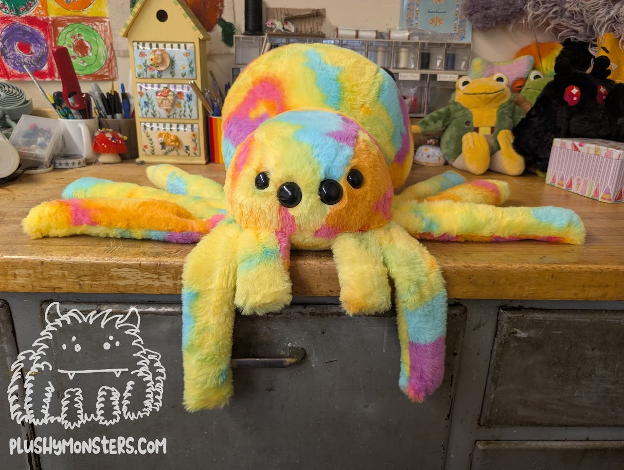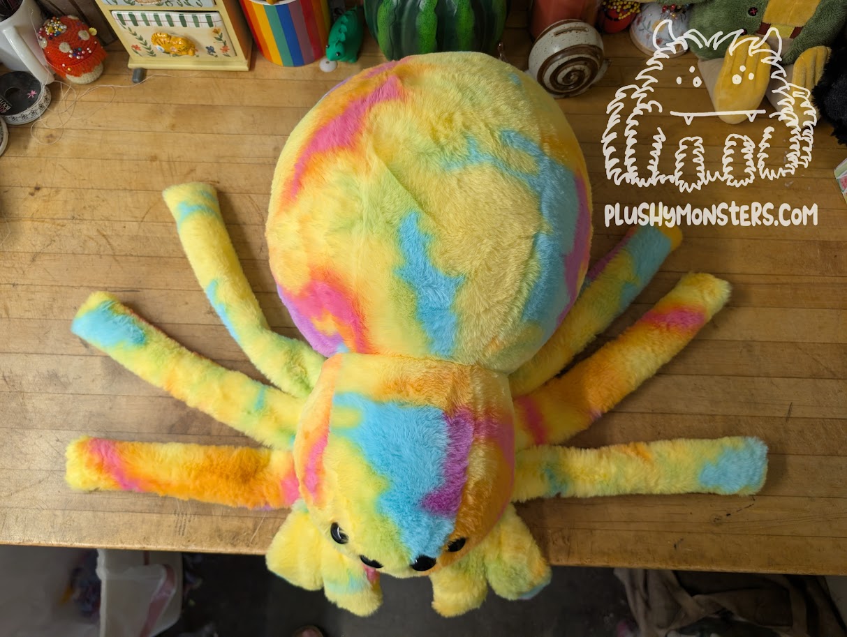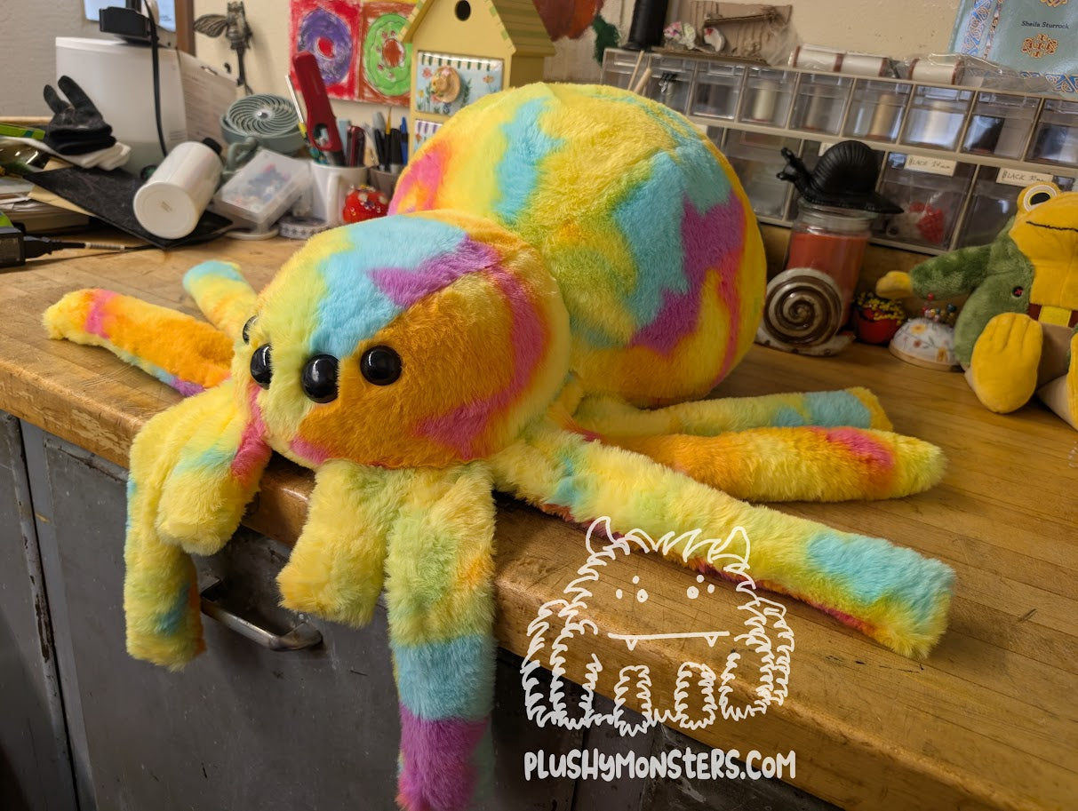 Sherbert is a Middlin'-sized weighted spider in extremely soft, short-pile fabric in yellow, pink, orange, and turquoise. This dude appears quite a bit smaller than a lot of our plushies due to the shortness of its pile, but it is made from the same pattern as all of our Middlin's. π This fabric was purchased from a craft store, and it's unclear whether we'll be able to get more in the future, so if you like this sweetie pie, I would recommend grabbing one. π₯° They would love to come home to be your newest, bestest buddy!
