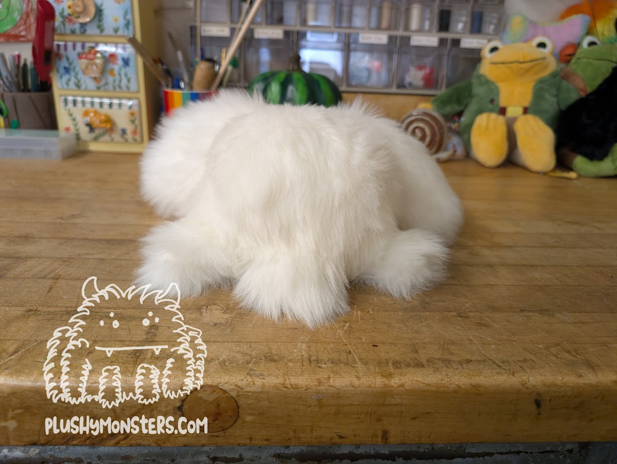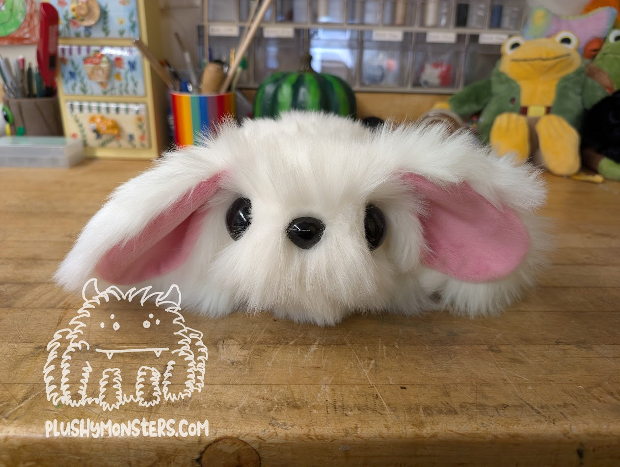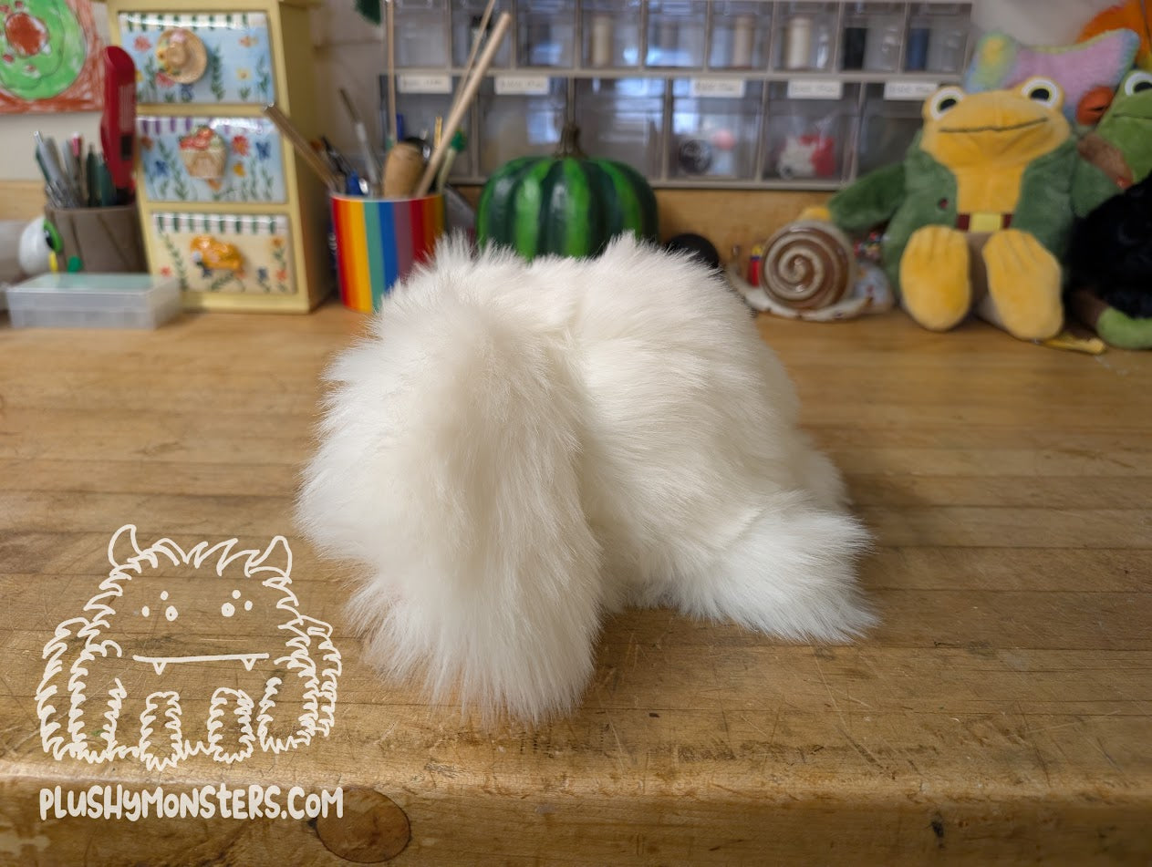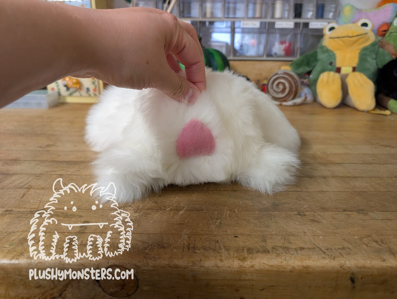 Whiffle is an adorable Bunny-esque Abomination made by Momma. 🥰 They are made from soft, short-pile Marshmallow faux fur. They feature two rather large ears lined in super soft pink minky fabric with a matching tail. They also have four stumpy little leggies, two rather large black plastic safety eyes, and an adorable triangular nose. THEY ARE SO FLIPPIN' CUTE, YOU DON'T EVEN KNOW! 🥰🥰🥰 They would love to come home to be your new besty!