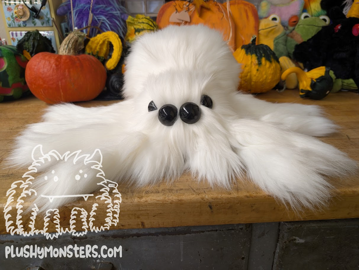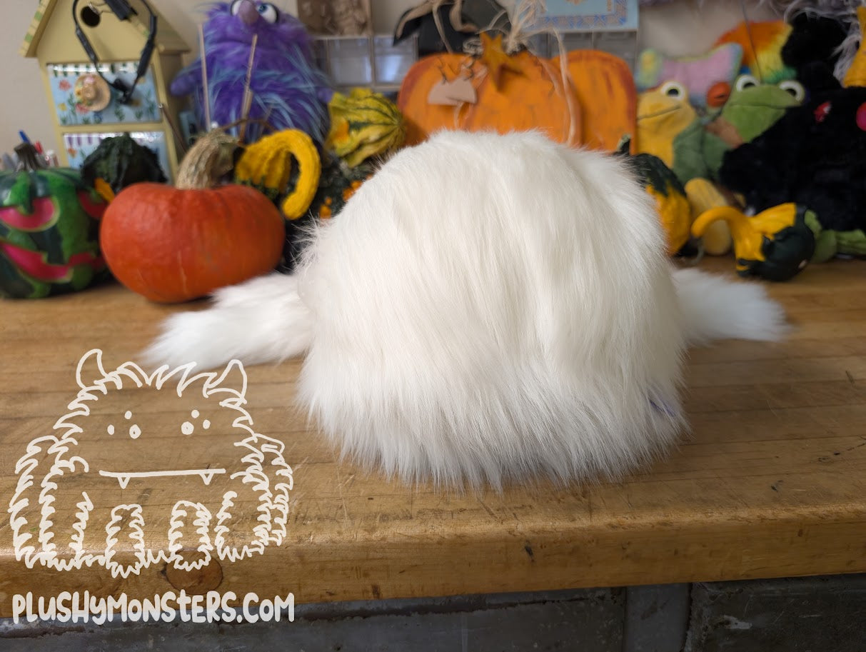 Zero is a Lil' Guy-sized weighted spider in white faux fur, with GINORMOUS BLACK EYES. πΆ I LOVE HIM SO FRICKIN' MUCH! π₯°π₯°π₯° Mom and I were going back and forth on where the eyes should be placed and how big we should place them. Long story short, he ended up with GIANT eyes that are quite close together compared to some of our other spiders. π¬ And now I want to make so many more! π
